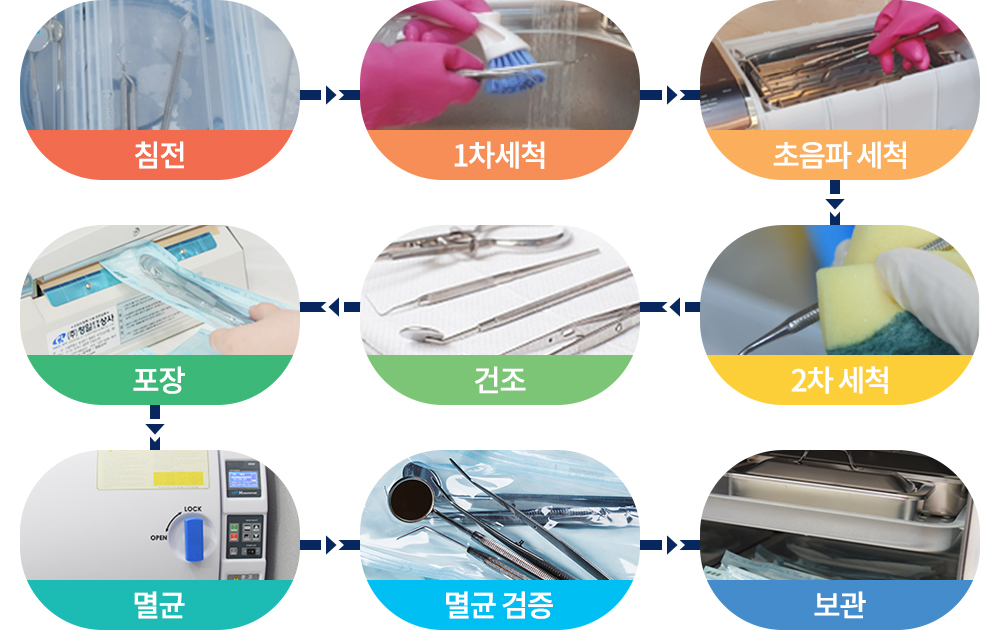 가장 감염에 주의해야 하는 기구는 한 사람당 1번만 사용합니다. 사용 후에는 단계별 멸균 시스템을 통해 철저하게 관리합니다.